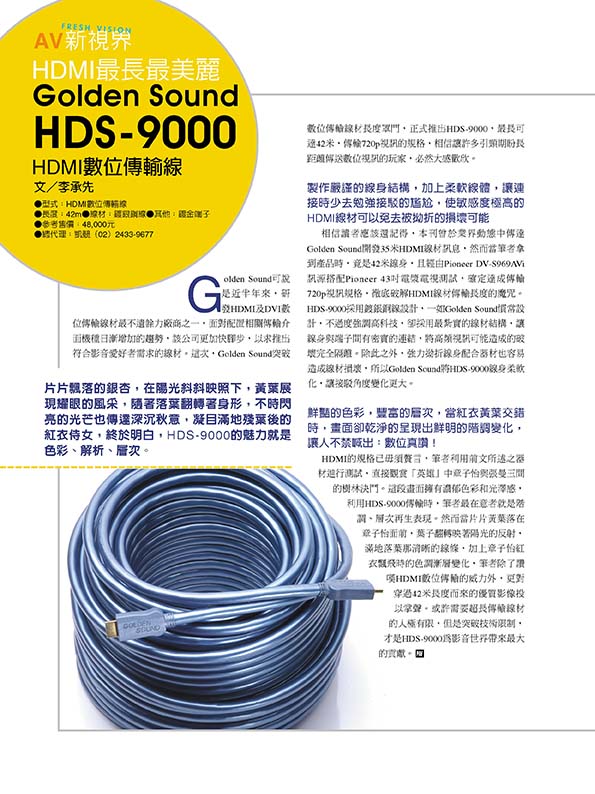 Golden Sound HDS-9000自2005年上市以来,始终受到发烧友的喜爱。2012年Golden Sound 利用4K巡回展的机会实测10M依然能完美通过4K的测试,2015年松下4K蓝光机上市后,Golden Sound 有幸第一时间购买到,实测HDS-9000/10M 过4k蓝光机规格。